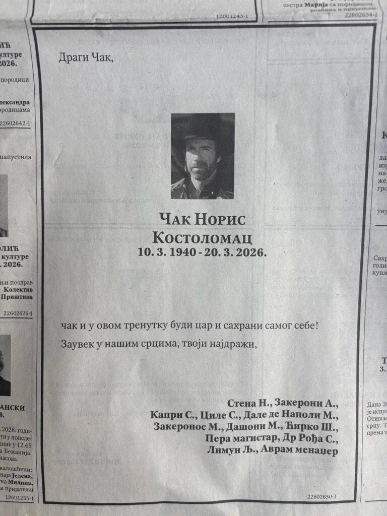 Američki glumac, majstor borilačkih veština i junak brojnih viceva u kojim se veličaju njegove sposobnosti i snaga – Čak Noris, koji je umro pre nekol