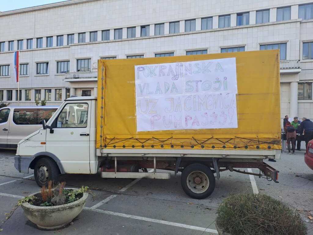 Na žuti kamion parkiran u blizini šatora građani okačili transparent “Pokrajinska vlada stoji uz Jaćimovića”