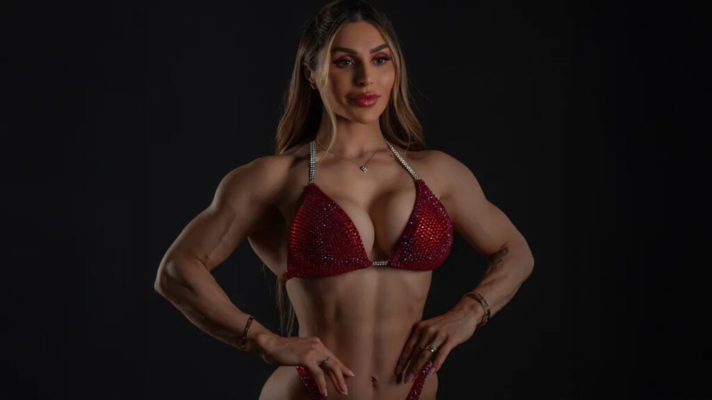 Žena stoji na bini i blista u bikiniju ukrašenom kristalima. Njena preplanula, sjajna koža ističe svaki jasno definisan mišić – rezultat sati proveden