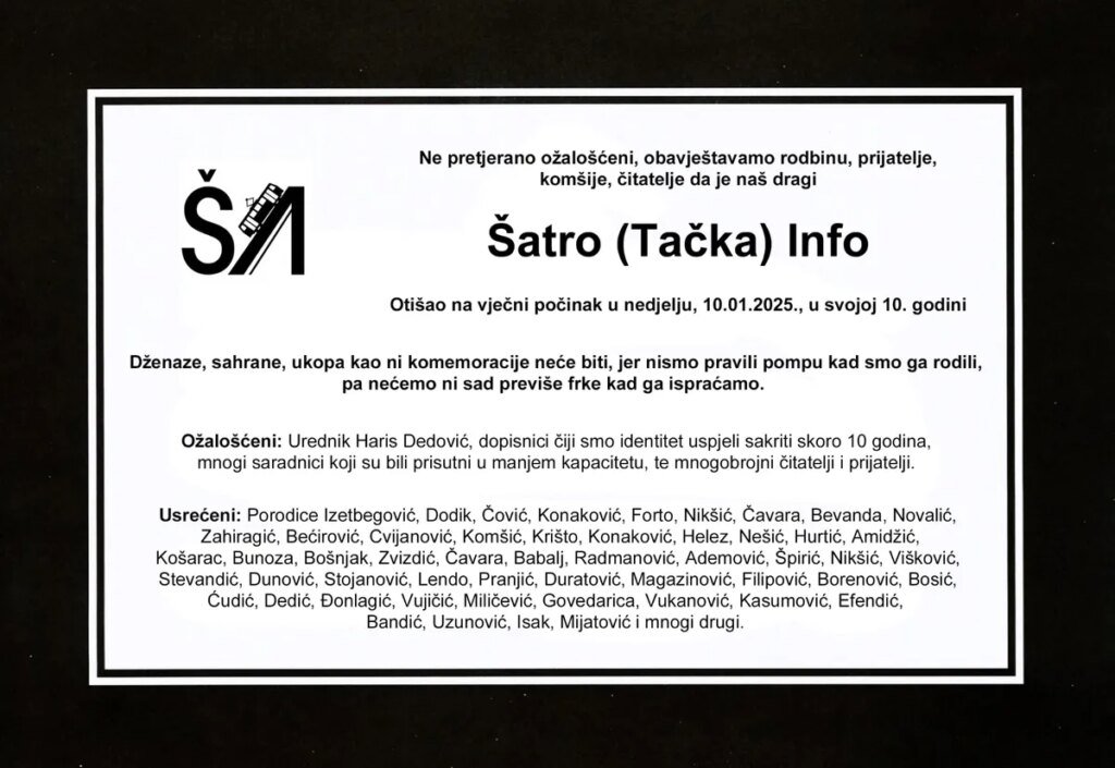 Satirični portal Šatro.info objavio je kako je stigao kraj njihovom radu nakon više od devet godina. Na Facebooku su objavili i simobličnu smrtovnicu,