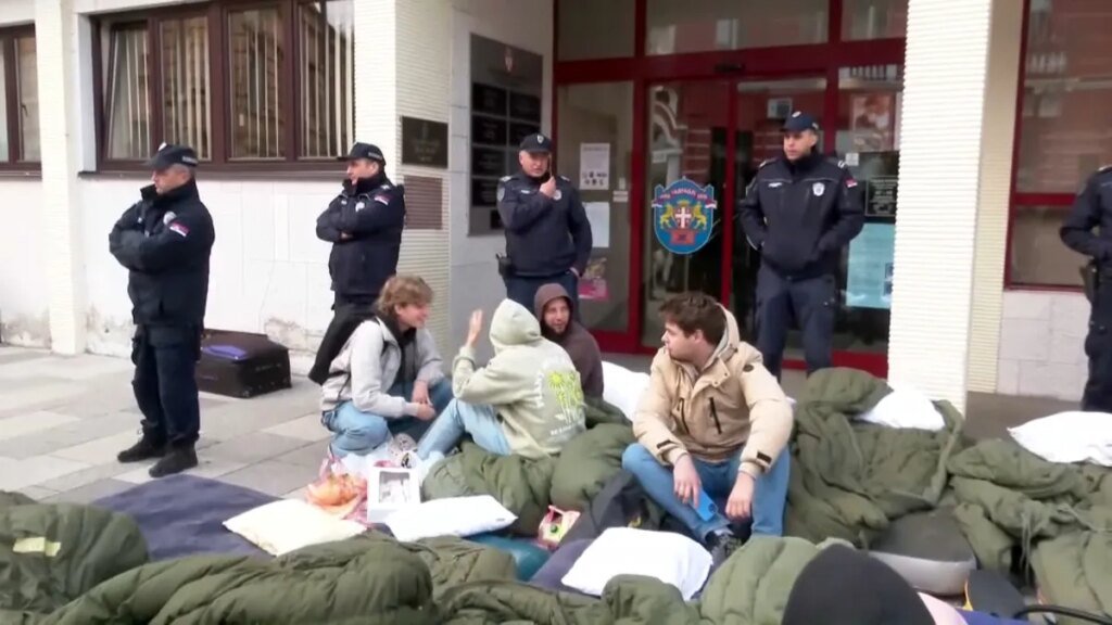 Studenti koji su pešačili do Novog Sada doneli su kasno sinoć dušeke ispred zgrade Gradske uprave Čačak i obavestili javnost da će tu provesti noć, u